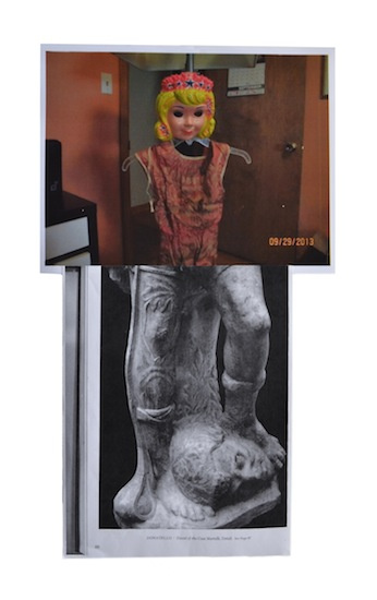 Although Bakhtin was focusing his theory on literary works, I found his thoughts encompassed many of the ideas contained in my artworks; the sculptures, collages and books included in my exhibition Battle embody these theories of carnivalization. They subvert and liberate the assumptions of the dominant style or atmosphere through humor and chaos, containing the relativity of joy that subverts. Each artwork weds and combines the sacred with the profane, the wise with the stupid and the beautiful with the grotesque. The jolly relativity of all things is proclaimed by alternative voices within the carnivalized images and sculptures. They challenge the authoritative voice of the hegemony through their mingling of high culture with the profane.