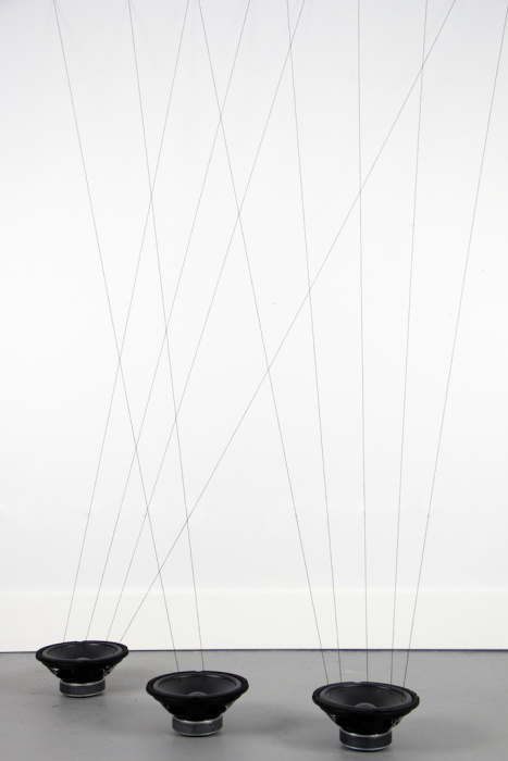 The audible tones in the piece were all sourced by recording the bowed sounds of a double bass performed by musician Sam Howard in my studio. Through electronic transformations, I subsequently arranged the resulting takes into the recorded composition that makes up this installed work. In this way the gallery pieces reference their origins through a cyclic action. The sounds of strings are brought into speakers, and the motions of these sounds then return back into strings.