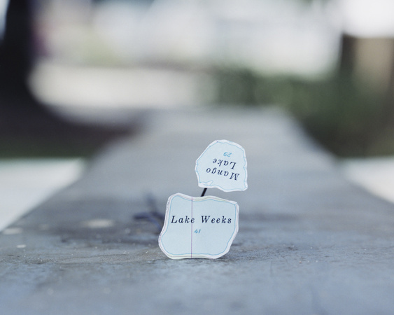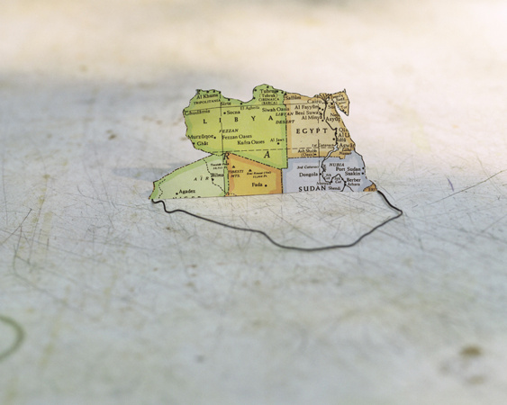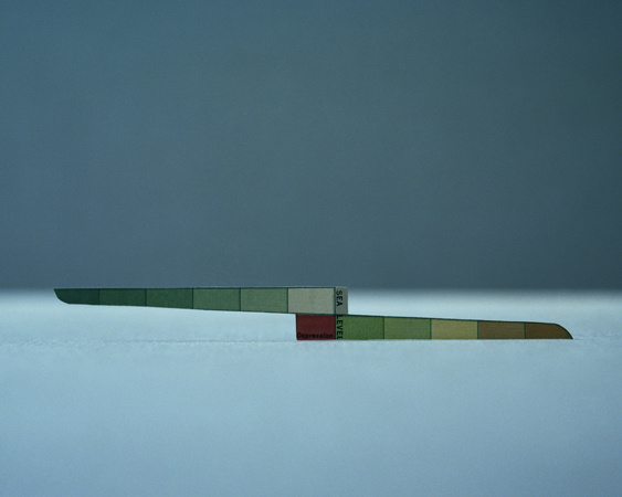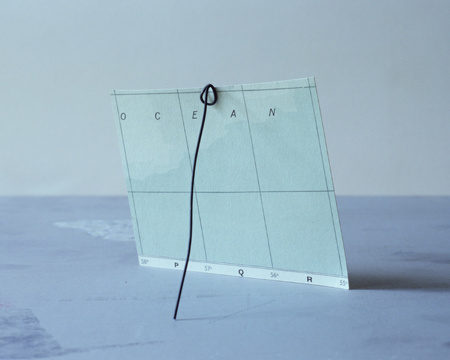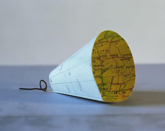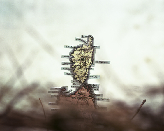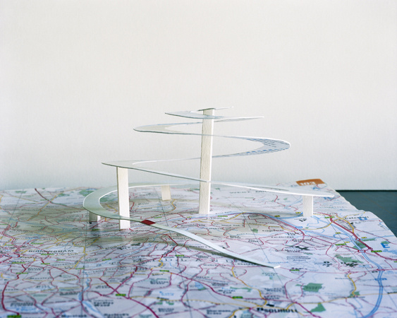The photographs in this series are informed by the varied ways that photography, mapping, drawing and sculpture have each tried to describe the landscape. By incorporating each of these methods, Folded in Place highlights the abstraction of the landscape traditionally offered by these means, while creating a tangible photographic “place” in each image that is occupied by a mapped construction. The images therefore provide precise photographic and mapped information while at the same time offering an abstraction of the landscape itself. The viewer is shown a landscape that is simultaneously understood and unknown, a landscape in which the map obtains a new geography of its own.