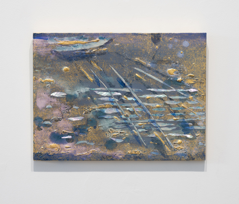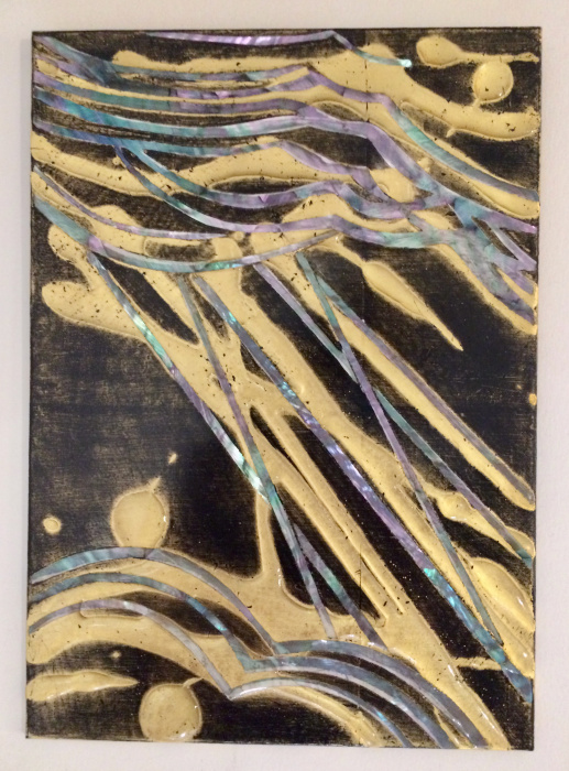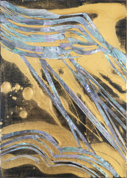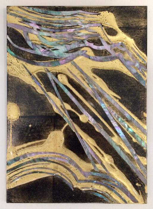 gold leaf, mother of pearl inlay, and resin on panel