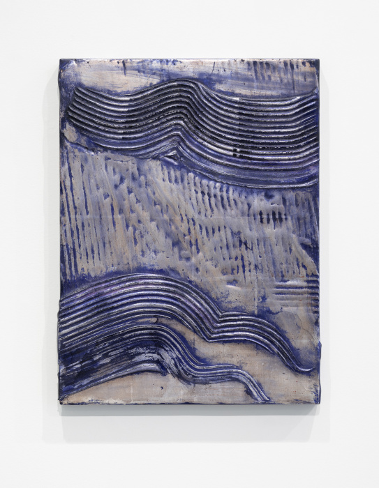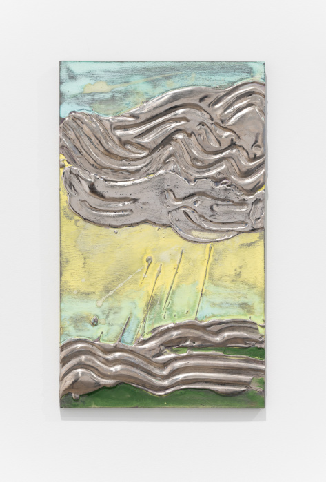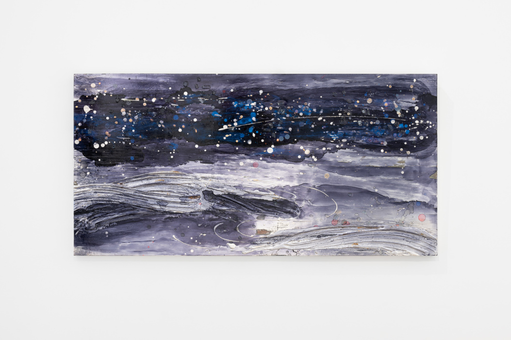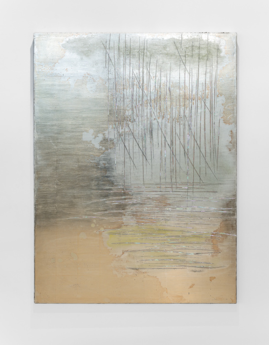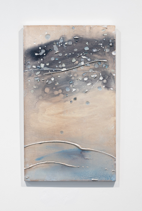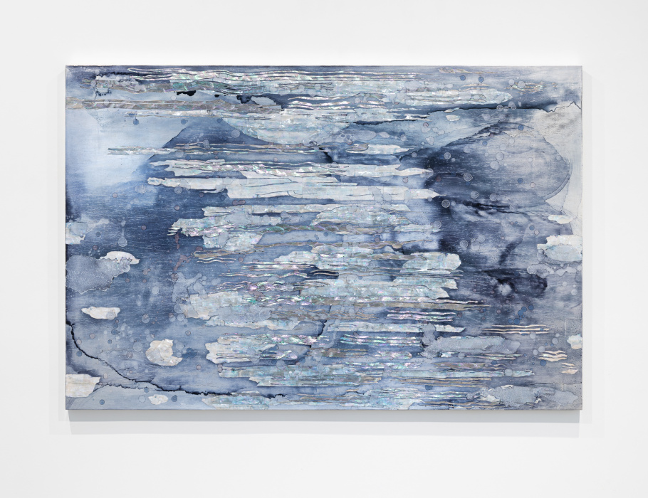 In essence, Lorenz's works depict sky and water. Unfettered by specific outcomes, the Artist employs a myriad of materials such as gilt glass, iron filings, sand, and metal leaf to allow for discovery and rumination within her drawing process.