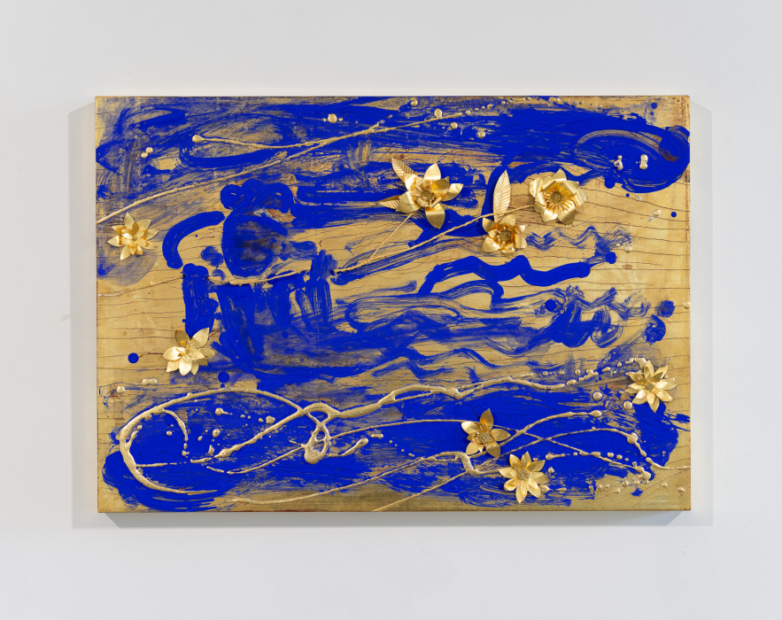 Lorenz starts every drawing with spontaneous, faint, and gestural lines and imagery. Building on that initial drawing, the Artist adds metal leaf materials and raised, leafed surfaces. Drawing inspiration from the history of ink painting and time spent living in Tokyo, Lorenz creates abstracted landscapes and studies in form that pay close attention to the juxtaposition of materials, shapes, and the hand of the artist.