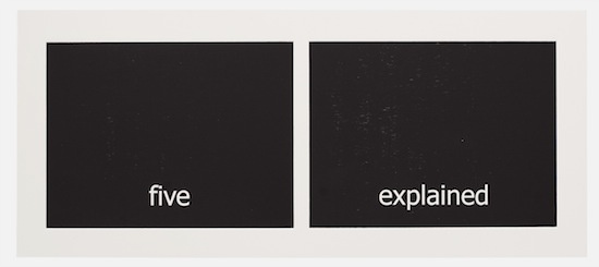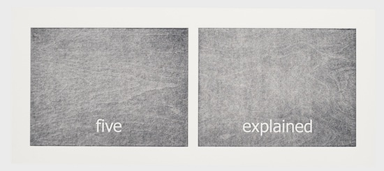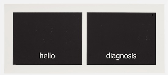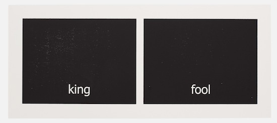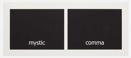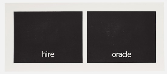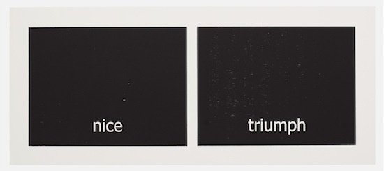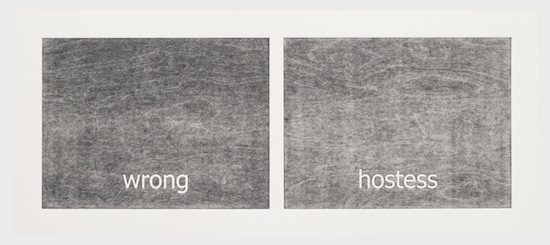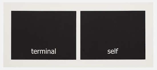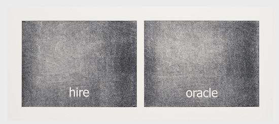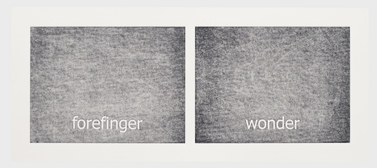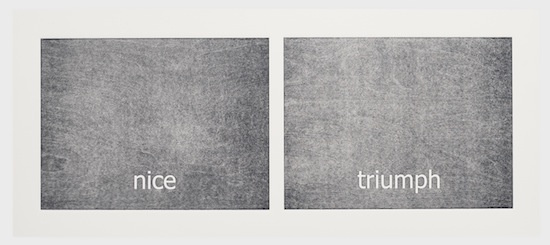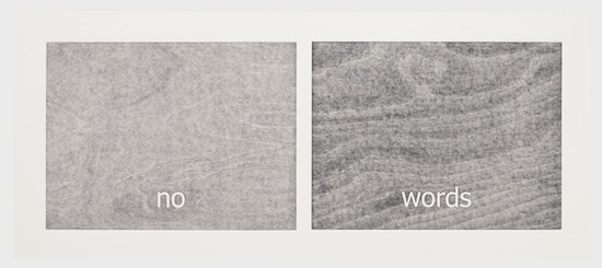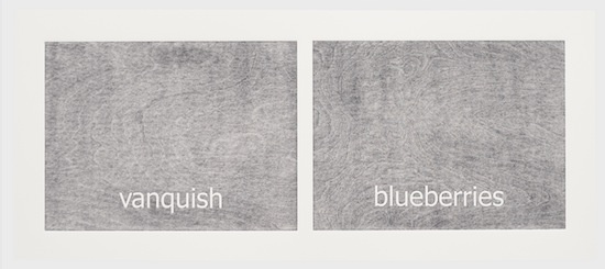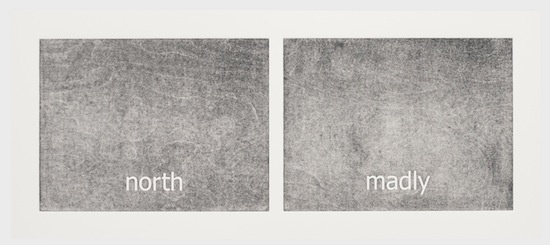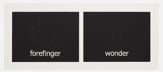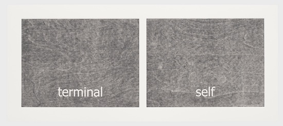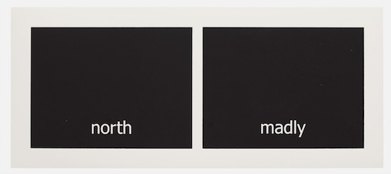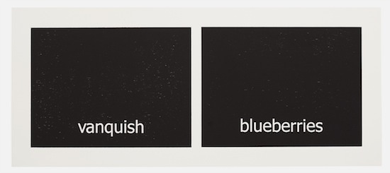 The work has its genesis in the most contemporary of language technologies: Haven harvested thousands of words from personal text conversations in the form of two lists. Then she employed a computer algorithm program, the sole purpose of which was to create a continuous random pairing of the words. These binaries are the core material of the work called “Subtitles.” Through the process of printing, the digitally generated words materialize into tactile (inked and embossed paper), physical form.