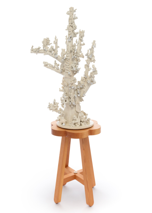 aquatint etching, handmade shellac cardboard frame on a painted handmade wood stand with paper flowers